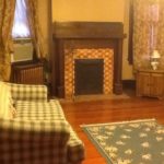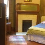Room 1 Second floor, is the largest bedroom, facing the street, with oak and tile fireplace, 2 closets, and windows with brocade curtains. It has an extra-long single bed, a white wooden rack for hanging towels and blankets, an antique tea cart with wheels and white rattan chair for a study area, and a tall white dresser for clothes. An extra single bed could be put in this room if needed. Status: Available